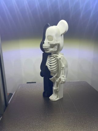 Figura colecionável estilo Bearbrick com design único. -20cm de altura - Metade do corpo em preto. - Metade do corpo em formato de esqueleto. - Detalhes anatômicos visíveis.
