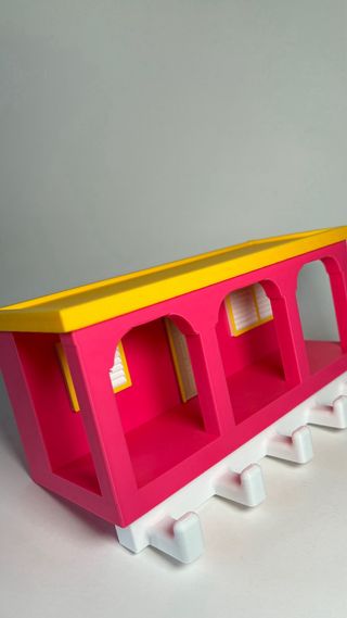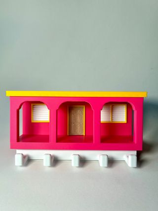 Porta-chaves inspirado em La Casita do Bad Bunny. Uma peça decorativa e funcional. - Design em cor-de-rosa vibrante com detalhes amarelos. - Base branca com cinco ganchos para chaves. - Detalhe de porta e janelas na estrutura.