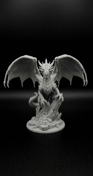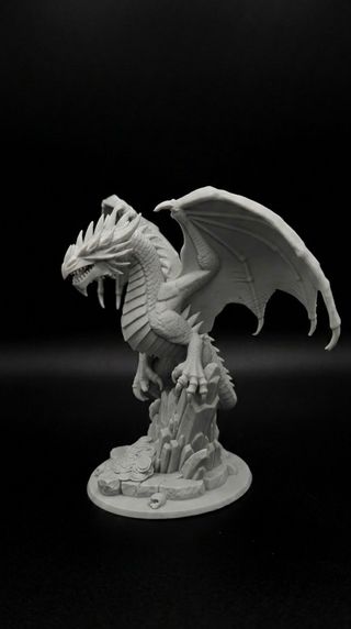 Miniatura de dragão em escala 55mm, ideal para colecionadores e jogadores de RPG. - Detalhes intrincados na escultura. - Base temática rochosa. - Cor Branco