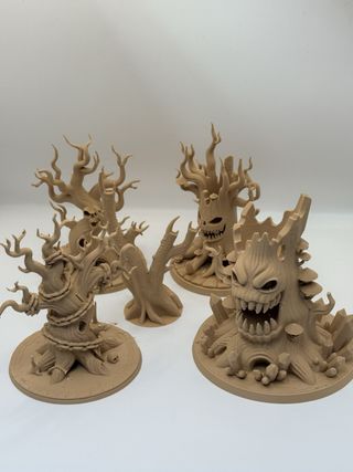 Conjunto de 5 miniaturas de Treants da Floresta Assombrada, perfeitas para jogos de RPG como D&D. - Design detalhado com rostos assustadores e galhos retorcidos. - Base circular para cada miniatura. - Ideal para colecionadores e jogadores. - Feito em PLA de madeira com pó de madeira. Textura e cheiro de madeira.