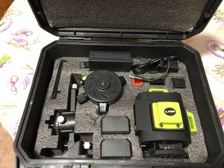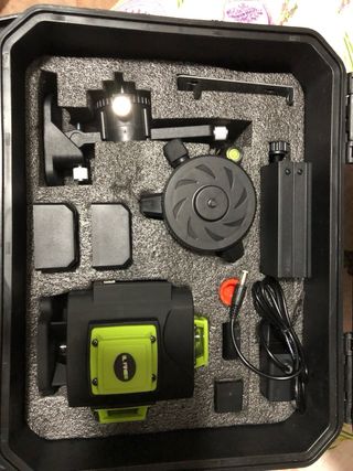 Nivel laser de 16 linhas com esquadria, em ótimo estado. Inclui tripé e acessórios. Ideal para trabalhos de nivelamento e alinhamento. - 16 linhas de laser. - Inclui tripé. - Acompanha acessórios diversos. - Em caixa de transporte.