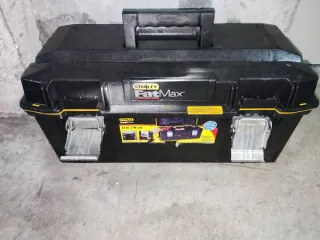 Caixa de ferramentas Stanley FatMax em preto. Possui fechos metálicos e pega para transporte. - Modelo FatMax. - Cor preta. - Fechos metálicos.
