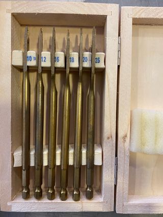 Los cinceles tienen hojas biseladas de longitud completa y mangos de polipropileno de agarre suave y resistentes a los impactos Hecho de acero cromo-vanadio endurecido, templado, finamente molido y revestido con laca transparente para proteger contra la corrosión Incluye seis cinceles (anchos de hoja: 6, 12, 20, 26, 32 y 38 mm), una guía de afilado y una piedra de afilar de óxido de aluminio Empaquetado en caja moldeada