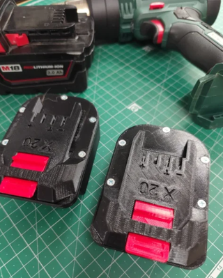 2 adaptadores para maquina parkside x20 para poder usar baterias milwaukee m18. Também fabricamos para outras marcas. Bateria e máquina não incluída. Impresso em 3d em petg