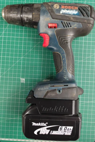 Adaptador para maquina Bosch PSR 12 14.4 para poder usar bateria makita 18v Também Fabricamos para outras marcas Bateria e máquina não incluída Impresso em 3d em petg