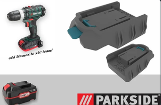 Adaptador para maquina parkside 20v max para poder usar bateria x20 da parkside também tenho para outras marcas. Bateria e máquina não incluída. Impresso em 3d em petg