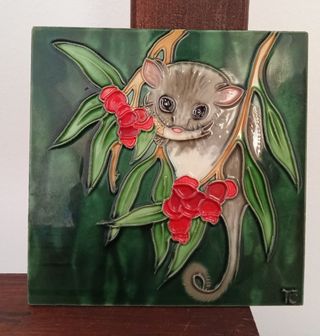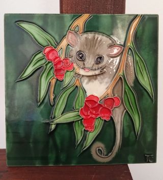 Azulejo decorativo em cerâmica com um adorável animal entre folhas e flores. - Dimensões: 15x15 cm. - Design em relevo. - Assinado pelo artista (TC). - Peça de coleção.