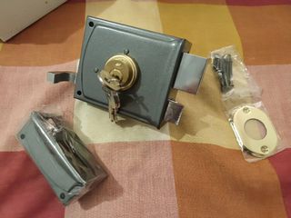 Fechadura de sobrepor com 3 chaves. - Fechadura de sobrepor. - Inclui 3 chaves. - Cor: Cinza escuro e dourado. Nova, na caixa. Fabricada em Portugal