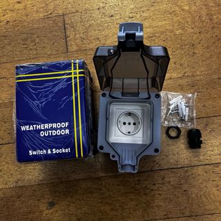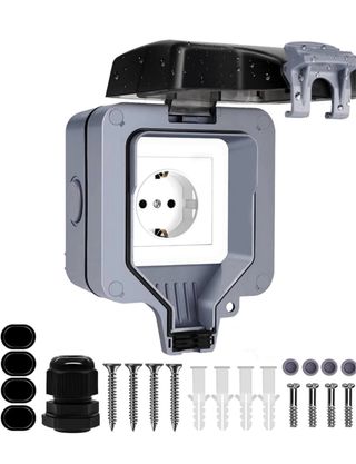 Tomada elétrica de exterior com proteção contra água e poeira. - Classificação IP66. - Design robusto e durável. - Inclui acessórios para instalação.