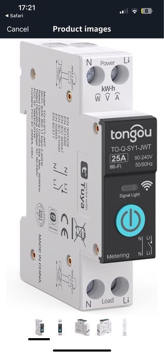 Interruptor medidor de energia inteligente da marca Tongou, modelo TO-Q-SY1-JWT. - Corrente nominal: 25A - Conectividade: Wi-Fi 2.4GHz - Tensão de operação: 90-240V AC, 50/60Hz - Compatível com Tuya Smart - Medição de consumo em kWh - Indicação de sinal Wi-Fi e luz indicadora