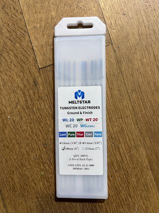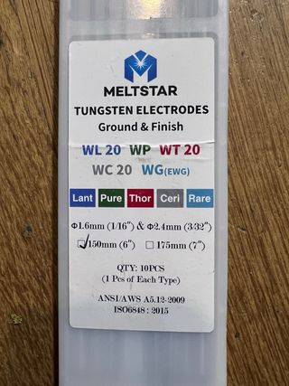 Pack de eletrodos de tungsténio Meltstar para soldadura TIG. - Inclui uma seleção mista de tipos de eletrodos. - Tipos disponíveis: WL 20, WP, WT 20, WC 20, WG(EWG). - Opções de composição: Lant, Pure, Thor, Ceri, Rare. - Diâmetros: 1.6mm (1/16) e 2.4mm (3/32). - Comprimentos: 150mm (6) e 175mm (7). - Quantidade: 10 peças (1 de cada tipo). - Conformidade com normas ANSI/AWS A5.12-2009.