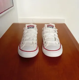 Sapatilhas Converse All Star em brancos número 32 - Design clássico. - Fecho com atacadores. - Detalhe de linha vermelha na sola.