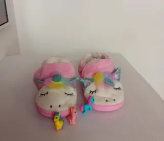 Pantufas adoráveis em forma de unicórnio, perfeitas para os mais pequenos. - Design divertido com chifre e orelhas de unicórnio. - Detalhes em arco-íris e glitter. - Material macio e confortável.com três bonecos de unicórnio de oferta