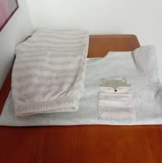 Conjunto de pijama infantil com um adorável padrão de raposa. - Padrão de raposa aplicado no bolso. - Calças com riscas em cinza e rosa. - Tecido macio e confortável.