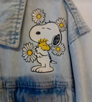 Casaco de ganga com um design divertido dos Peanuts. - Estampa PEANUTS nas costas. - Ilustração do Snoopy com flores.