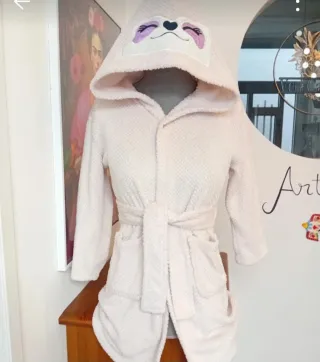 Roupão infantil macio e confortável, com um divertido capuz de preguiça. - Material felpudo. - Fecho com cinto. - Bolsos frontais.