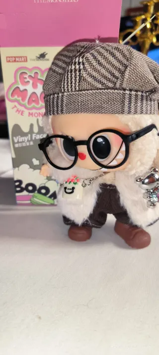 Boneco Labubu com acessórios. - Chapéu xadrez. - Óculos redondos pretos. - Casaco de pelo. - Pingente de urso. - Detalhe de bolsa com flores.