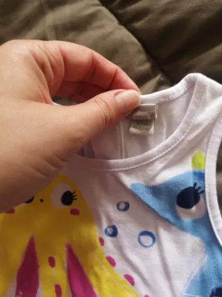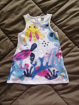 Vestido branco com estampa de fundo do mar. - Estampa com polvo, cavalo-marinho, tartaruga e corais. - Cores vibrantes: amarelo, rosa, azul e roxo. - Sem mangas.