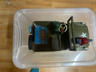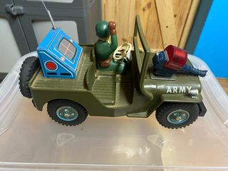 Um divertido jeep militar de brinquedo com um soldado. - Jeep verde com detalhes em branco. - Soldado com capacete e braço levantado. - Acessórios como antena e canhão. - Pneu sobressalente na parte traseira. - Funciona com pilhas