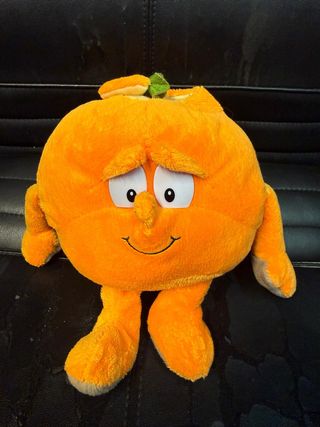 Boneco de pelúcia em formato de laranja. - Cor laranja vibrante. - Material macio e fofo. - Detalhes de rosto e membros.