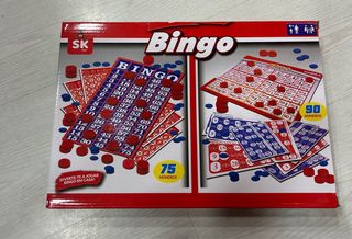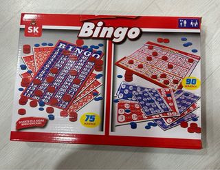 Jogo de bingo completo da marca SK Toys, ideal para diversão em casa. Inclui cartelas e marcadores. - Contém 75 e 90 números. - Inclui cartelas de Bingo Loto. - Marcadores vermelhos e azuis.