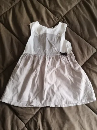 Vestido infantil com uma charmosa estampa de gato na parte superior. - Parte superior branca com estampa de gato. - Saia em tom claro. - Detalhe de laço. - Sem mangas.