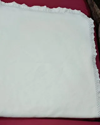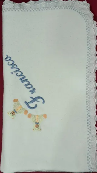 Manta de bebé em tecido macio, com bordado personalizado. - Nome bordado: Francisca - Desenho de dois ursinhos. - Acabamento com renda delicada na borda.