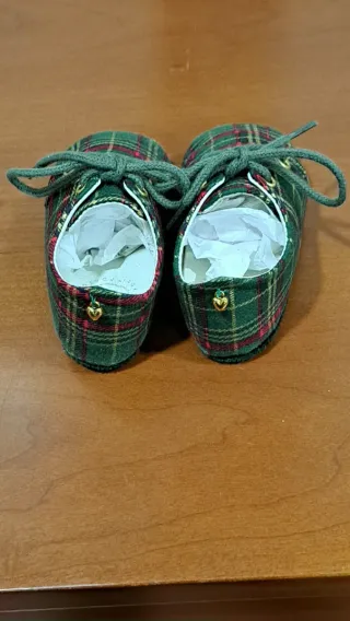 Adoráveis sapatos de bebé com padrão xadrez. - Padrão xadrez em verde, vermelho e amarelo. - Fecho com atacadores verdes. - Detalhes em dourado nos ilhós.