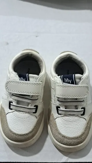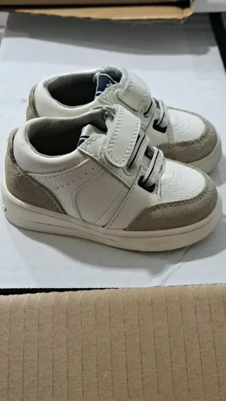 Sapatilhas para menino em pele branca com detalhes em camurça. - Fecho de velcro. - Detalhe de atacadores. - Sola em borracha.