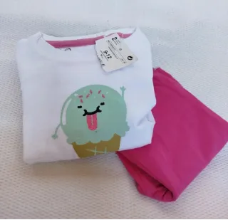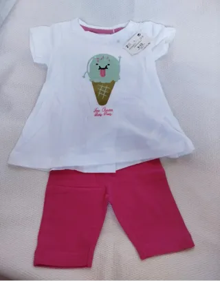 Conjunto de duas peças para menina, tamanho 9/12 meses. - T-shirt branca com estampa divertida de gelado. - Calças cor-de-rosa. - Tamanho: 9-12 meses. #conjunto €menina #novo #9meses #12meses #code #verao