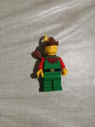 Figura Lego Forestman usada, modelo Cas140a. - Peça de colecionador. - Detalhes em verde e vermelho. - Chapéu marrom com pena amarela. - Acessório de arco e flechas nas costas.
