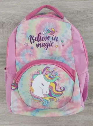 Mochila infantil com um design divertido de unicórnio e padrão tie-dye. - Cor principal rosa. - Estampa de unicórnio com crina colorida. - Padrão tie-dye em tons pastel. - Bolso frontal com fecho. - Alças ajustáveis.