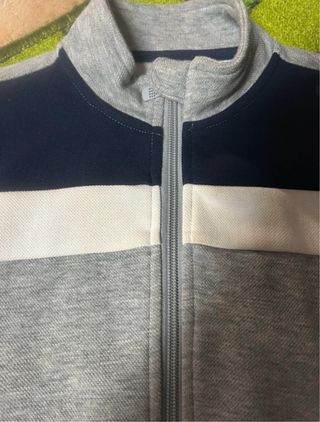 Casaco de menino com um design moderno e confortável. - Cor principal cinzenta com detalhes em azul marinho e branco. - Fecho completo à frente. - Gola alta. - Bolsos laterais.