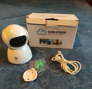 Câmara de vigilância inteligente com armazenamento em nuvem. Ideal para monitorização. - Design branco moderno. - Conectividade avançada. - Inclui acessórios de montagem.
