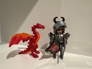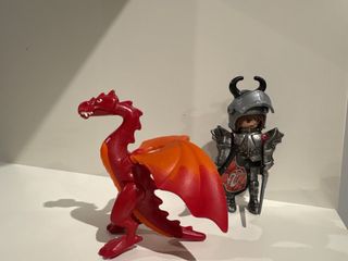 Conjunto de figuras Playmobil com um dragão vermelho e um cavaleiro. - Figura de dragão vermelho com asas. - Figura de cavaleiro com armadura e capacete. - Tema: Idade Média.