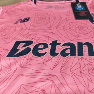 Equipamento infantil do FC Porto, cor rosa. - Design com padrão geométrico. - Detalhes em azul marinho nas mangas e laterais. - Logo da New Balance e emblema do clube visíveis.