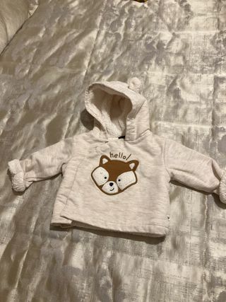 Casaco forrado para bebé, muito quente e confortável. - Estampa de raposa com hello!. - Capuz com orelhas. - Punhos e barra forrados. Tamanho 3 meses