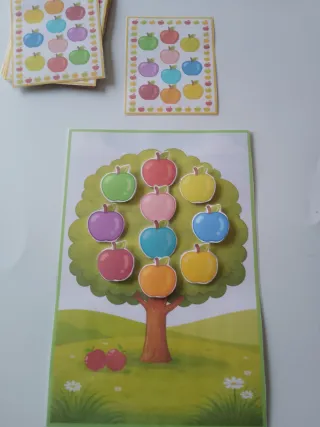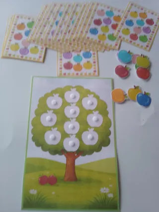 Jogo educativo Montessori com maçãs coloridas para aprender e se divertir. - Inclui um tabuleiro com uma árvore e maçãs. - Maçãs em diversas cores vibrantes. - Ideal para o desenvolvimento infantil.