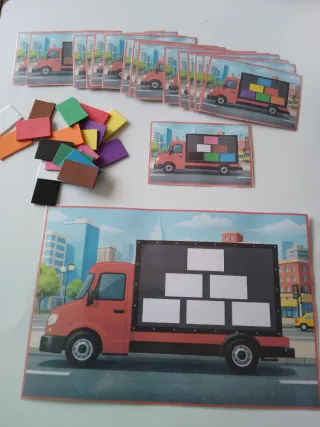 Jogo educativo Montessori com peças coloridas para encaixar no caminhão. - Peças em espuma colorida. - Inclui tabuleiro com desenho de caminhão. - Estimula a coordenação motora e o reconhecimento de cores.