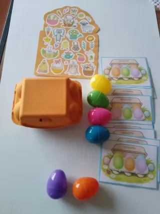 Jogo educativo Montessori com ovos coloridos para estimular o desenvolvimento infantil. - Inclui 6 ovos de cores variadas. - Feito de plástico resistente Caixa ( core aleatoria) Stickers pascoa - Ideal para atividades de aprendizado e coordenação.
