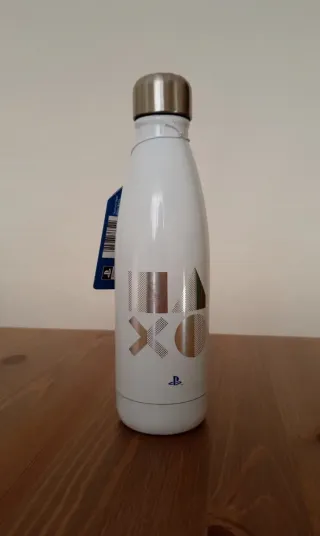 Garrafa de água com design inspirado na Playstation. Perfeita para fãs da marca. - Cor branca com detalhes prateados. - Símbolos icónicos da Playstation. - Tampa metálica. - Material: Aço inoxidável.