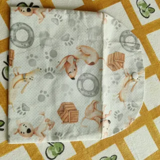 Bolsa artesanal com um divertido padrão de cães e ossos. Fecho de botão. - Tecido com padrão de cães, patas e ossos. - Fecho de botão branco. - Acabamento artesanal.