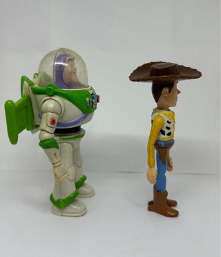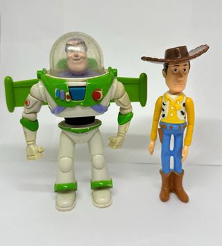 Conjunto de figuras de Toy Story do McDonald's de 2000, com Buzz Lightyear e Woody. - Buzz Lightyear com capacete transparente e asas. - Woody com chapéu de cowboy e colete. Buzz Lightyear Happy Meal 2000 McDonald’s Cerca de 12 cm altura Woody Happy Meal 2000 McDonald’s Cerca de 10 cm altura Atenção: Sinais de uso e desgaste