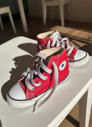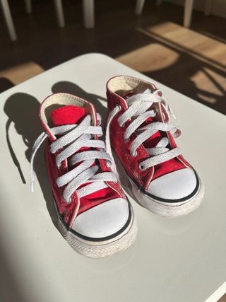 Tênis de cano alto da Converse em vermelho, tamanho 23. - Fecho com atacadores brancos. - Biqueira em borracha. - Design clássico da marca.