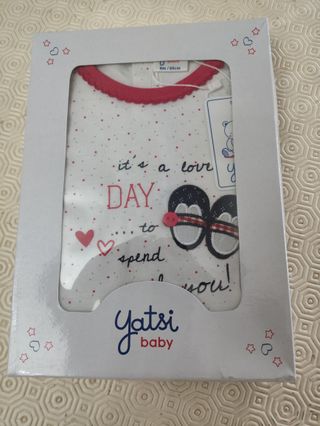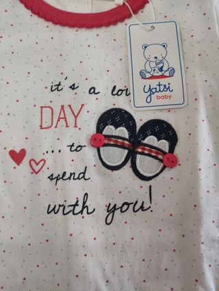 Body para bebé menina da marca Yatsi, com um design divertido e colorido. - Tamanho 6m/68cm. - Estampa It's a love day to spend you! com sapatinhos. - Gola e acabamentos em rosa. - 100 % algodão - abertura nas pernas e atrás - Embalagem original.