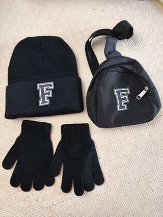 Conjunto infantil composto por gorro, luvas e mochila. - Gorro preto com detalhe F branco. - Par de luvas pretas. - Mochila preta com detalhe F branco e fecho de correr. - Novo nunca usado Custos envio a cargo do comprador.