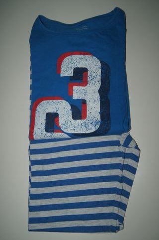 Conjunto de pijama para crianças, tamanho 12-13 anos. - T-shirt azul com número 3 estampado. - Calças com padrão de riscas azuis e cinzentas.