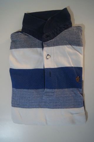 Polo de manga comprida com um design às riscas em azul e branco. Apresenta um padrão de espinha de peixe em algumas secções. - Gola polo com botões. - Padrão às riscas. - Detalhe de espinha de peixe.