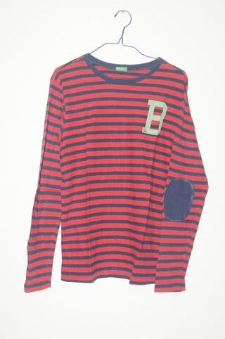 Camisola de manga comprida da Benetton, com um padrão de riscas vermelhas e azuis. - Detalhe de B verde no peito. - Joelheiras azuis. - Tamanho 13-14 anos.