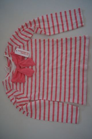 Camisola às riscas brancas e cor-de-rosa para menina, tamanho 7-8 anos. Possui um laço grande e decorativo na frente. - Riscas horizontais brancas e cor-de-rosa. - Laço grande em tecido cor-de-rosa. - Com etiqueta.